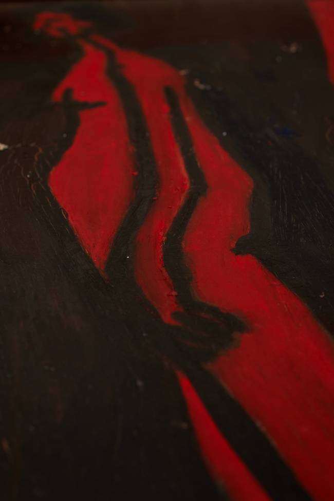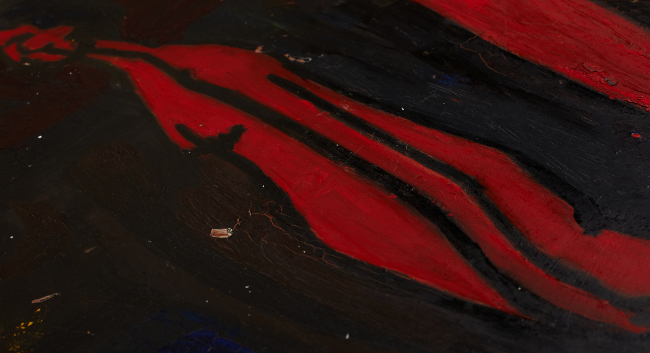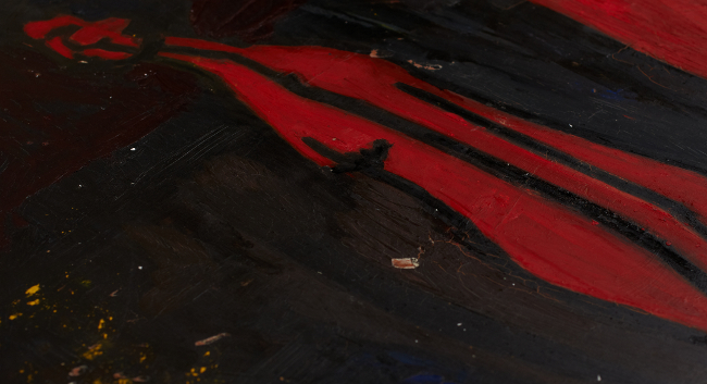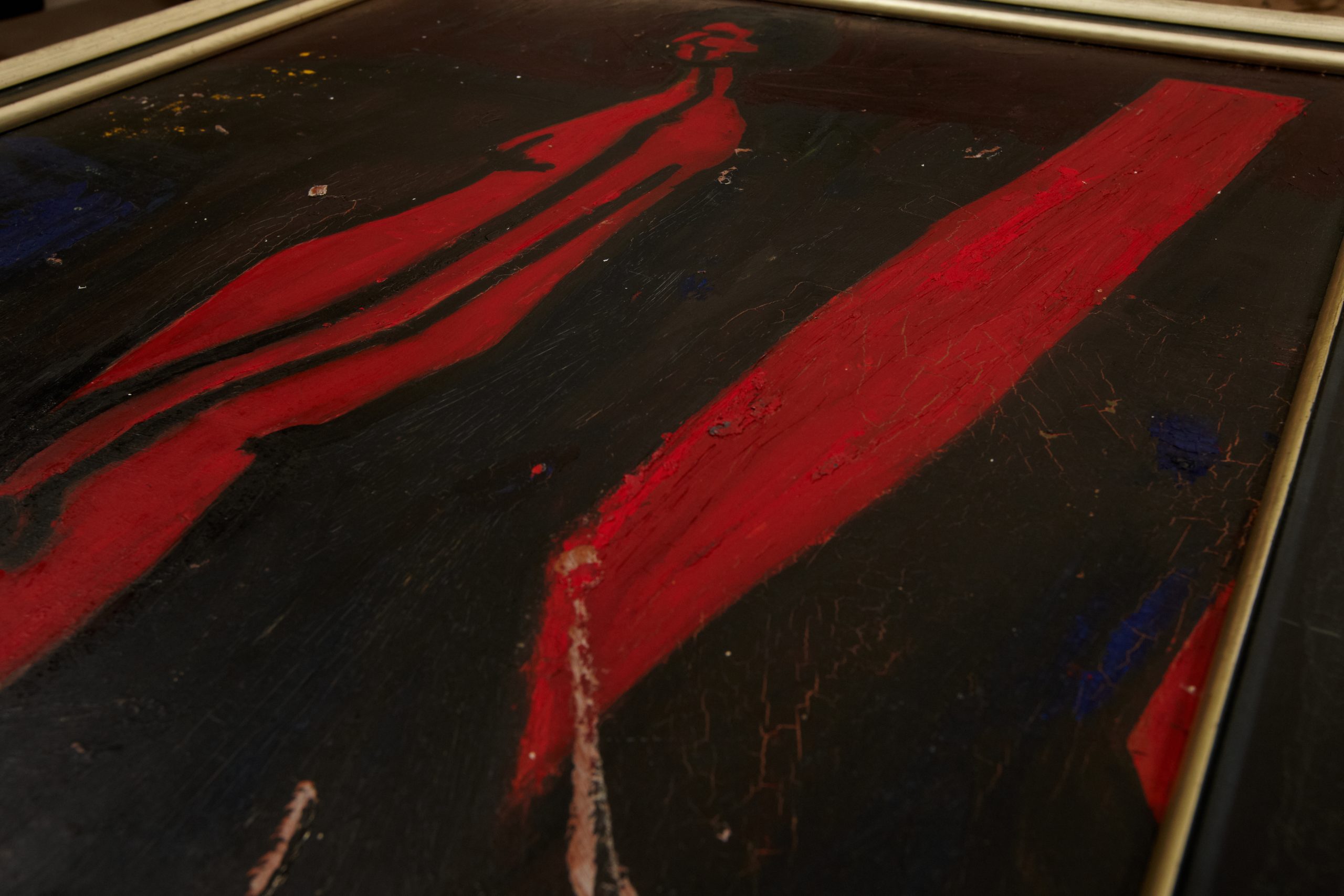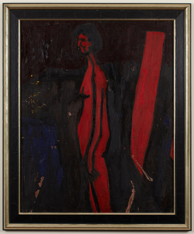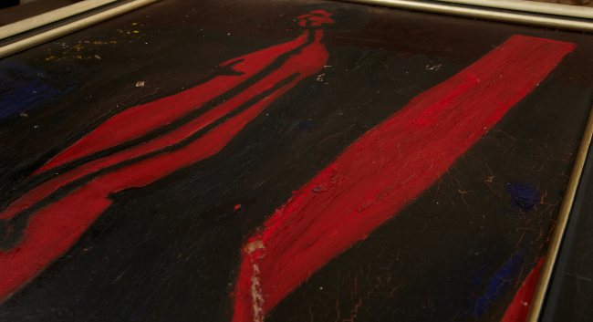 The abstract work in oil depicts a red figure side-on with unflattering features including ‘moobs’ and a large stomach.