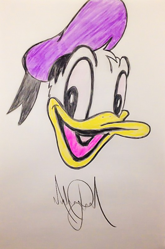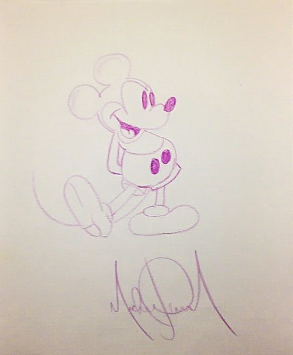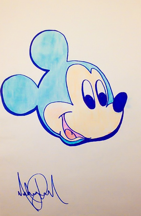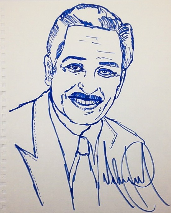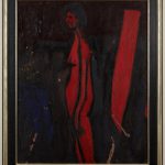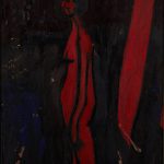 However, this work shows his talent for art, a hobby that later in his life he returned to. The figure in red is set against a black background and looks drawn and despondent. The distinctive spectacles are absent and it appears he had turned his skill for unflattering depictions on himself.
